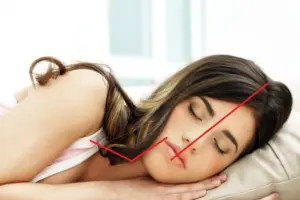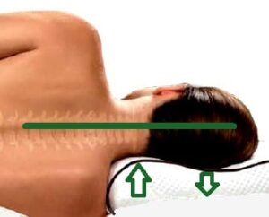 is een verkeerd hoofdkussen. Op de afbeelding is goed te zien dat het hoofdkussen te dik is. De nek komt in een rare knik te staan. Ga eens een half uurtje in deze houding zitten of staan en je krijgt vanzelf een pijnlijke nek. Kan je voorstellen wat er gebeurt wanneer je deze houding een aantal uren in bed aanneemt.